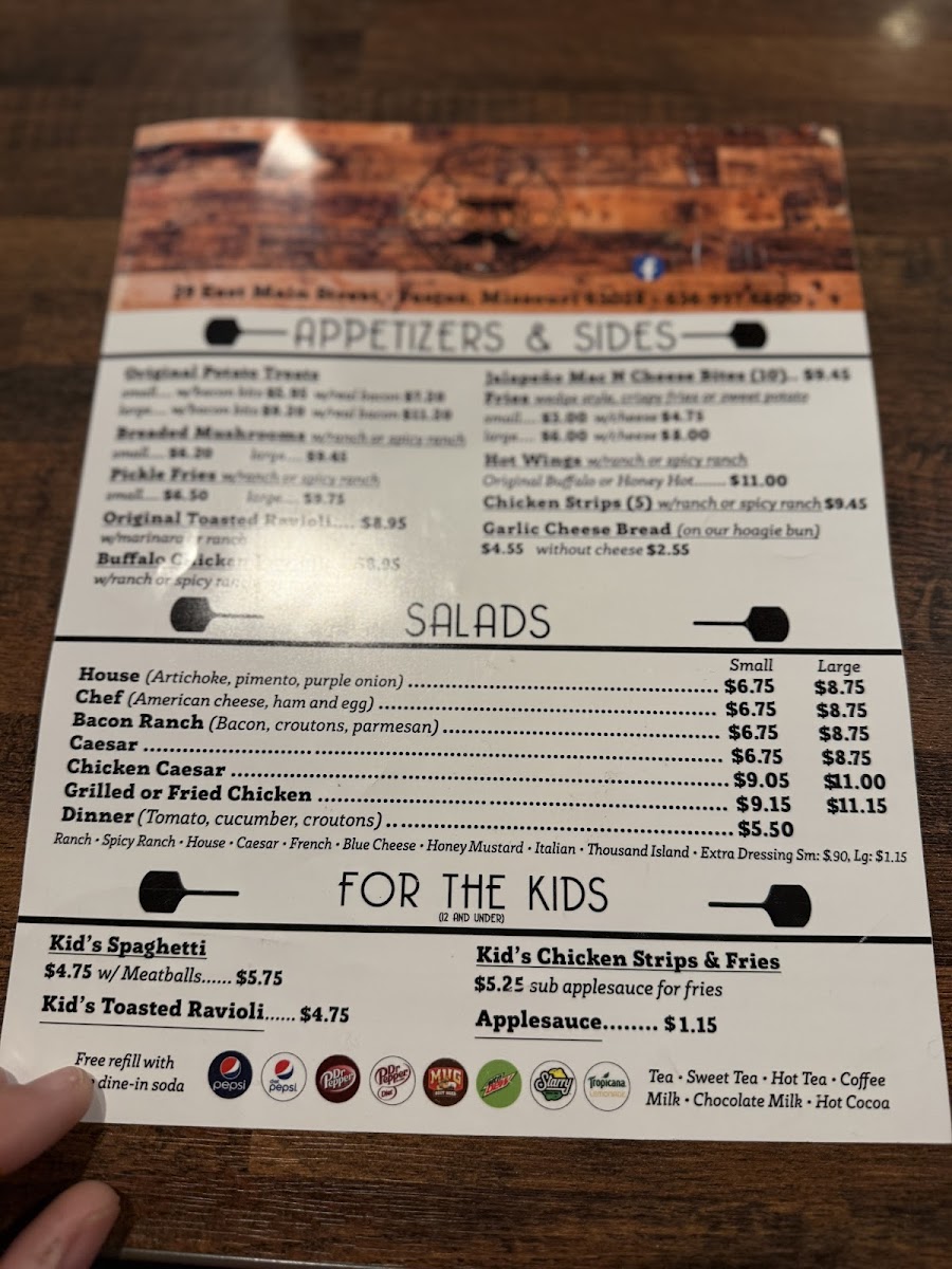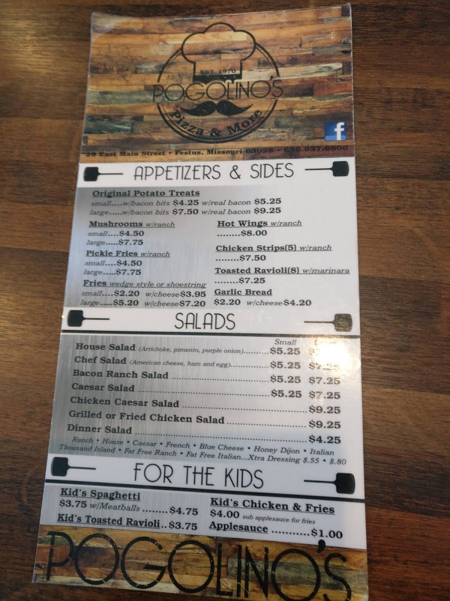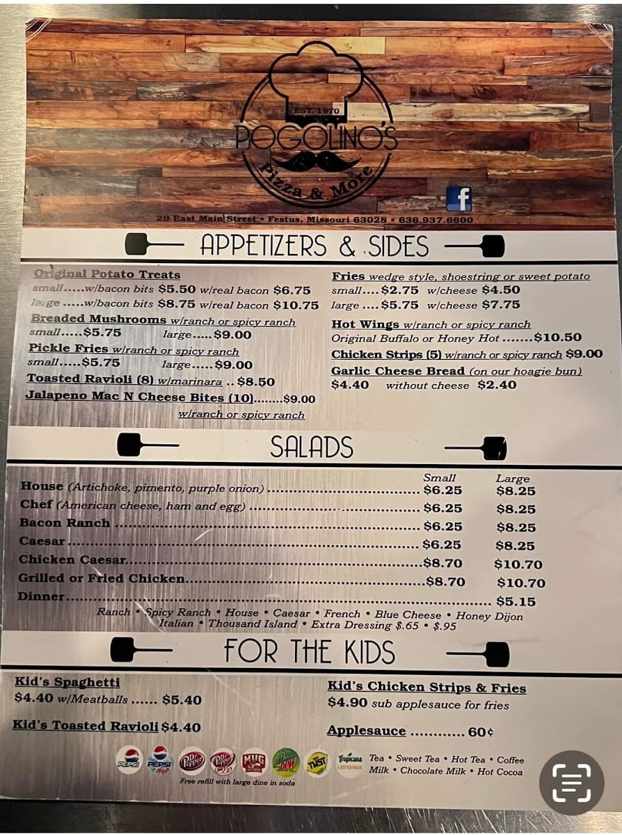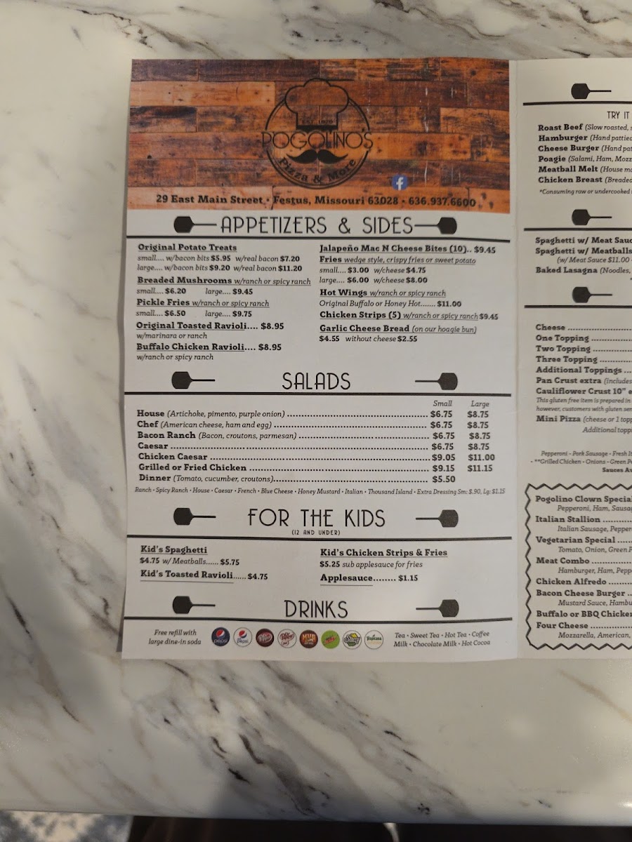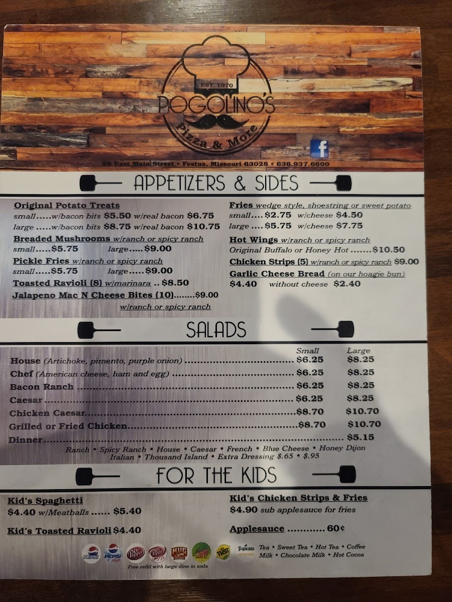 Overall, Pogolino’s Pizza Place offers a comforting, family-friendly lineup of classics that stay true to Midwestern diner charm, with plenty of familiar flavors to satisfy everyone at the table. The menu highlights a range of approachable starters like Original Potato Treats, Breaded Mushrooms, Pickle Fries, Original Toasted Ravioli, and Buffalo Chicken Ravioli, each offering a warm, shareable beginning to the meal. Salad options such as the House, Chef, Bacon Ranch, Caesar, and Chicken Caesar provide lighter choices while still keeping the focus on hearty, satisfying ingredients. Even the little ones get their own comforting options with Kid's Spaghetti, Kid's Toasted Ravioli, Kid's Chicken Strips & Fries, and Applesauce. To pair with the food, the drink selection spans approachable favorites, from draught options like Michelob Ultra, Amber Bock, Busch Light, Yuengling Lager, and rotating Seasonal picks, to bottled staples including Budweiser, Bud Select, Michelob Ultra, Bud Light, and Busch. Additional offerings like Nütrl canned beverages, wine choices such as Cabernet Sauvignon, Chardonnay, Pinot Grigio, and Moscato, and well-loved beers-from Bud Light Draught to Miller Lite Bottle-round out the selection. Simple beverages like Tea and Milk ensure there’s something for every preference. Altogether, the menu captures a sense of comfort and familiarity, making Pogolino’s a welcoming stop for casual dining with reliable, crowd-pleasing flavors.